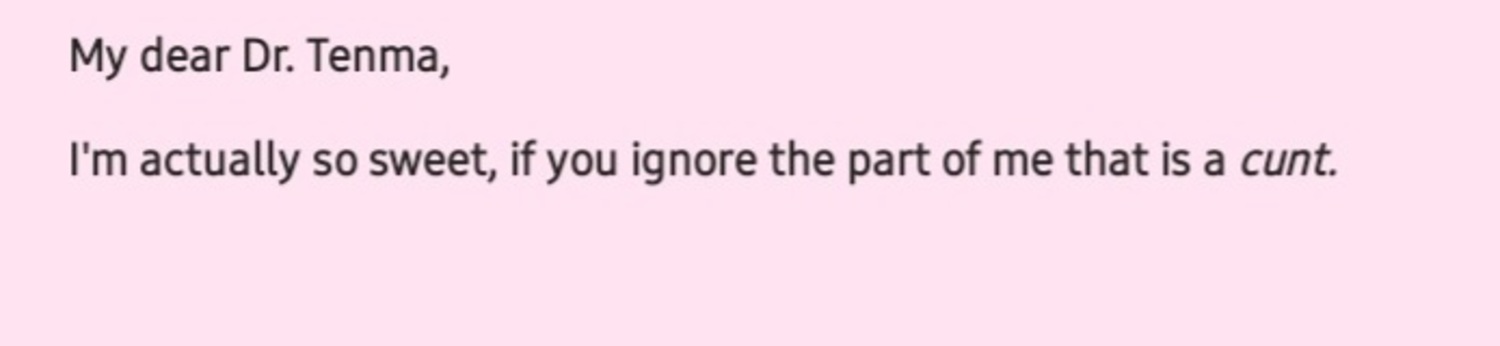 Tenma's pet names for Johan reserves only during sex or other intimate moments. His are just standards: baby, honey, are the most common ones, less common sweetie, very RARELY 'my sweet Angel', and when he says this, it's mostly when he makes mistakes over trivial domestic stuff, Johan gets upset or shuts him out and he tries to woo him back, but bc this is trivial stuff, Tenma also says this w/ playful intent, hint of mockery. Johan knows when he calls him that, it's mostly Tenma trying to joke around and lighten the tense atmosphere. Also, I have posted the 1st version of this here: https://x.com/deNamelessHuman/status/1927306388490874977?t=cVCLnt0C4f1670_J3Vql7Q&s=19